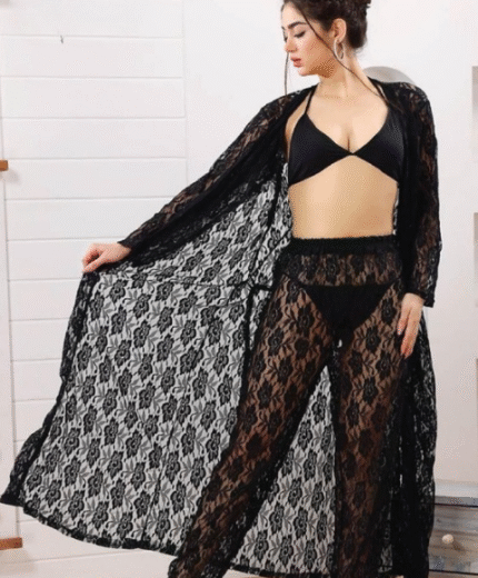 Detail of 4 pieces, 2 piece bikni set, 1 net trouser and 1 net goun.